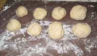 Form into a ball and turn out onto a lightly floured surface. Knead just to form a smooth ball. Divided into 8 even pieces and form each into a ball.